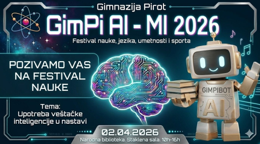 30. mar 2026. 13:00 Gimnazija Pirot organizuje tradicionalni Festival nauke, jezika, umetnosti i sporta – „GimPi Fest“, koji ove godine nosi naziv „GimPi AI – MI 2026“.Tema ovogodi&... -