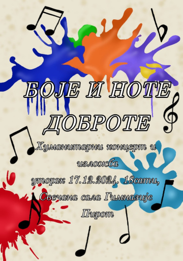 17. dec 2024. 08:27 U Svečanoj sali Gimnazije Pirot biće održan humanitarni koncert pod nazivom „Boje i note dobrote“. Koncert će se održati u utorak, 17.decembra, sa početkom u 18 sati. Hor, orkestar i ... -