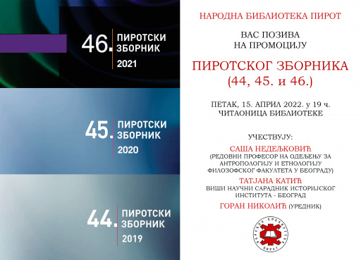 13. apr 2022. 10:19 U petak, 15. aprila, biće održana promocija Pirotskog zbornika. Promocija će se održati u čitaonici izdavača – Narodne biblioteke Pirot, s početkom u 19 sati.S obzirom da zbog epidemiološ... -