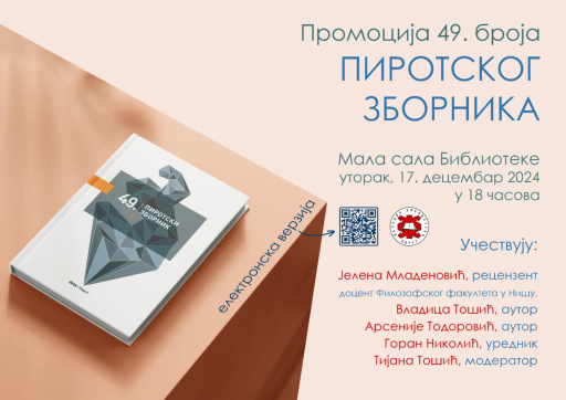 17. dec 2024. 08:38 U utorak, 17. decembra 2024. godine, sa početkom u 18 sati, u Maloj sali Narodne biblioteke Pirot održaće se promocija 49. broja Pirotskog zbornika.O Zborniku će, pored glavnog i odgovornog urednika ... -