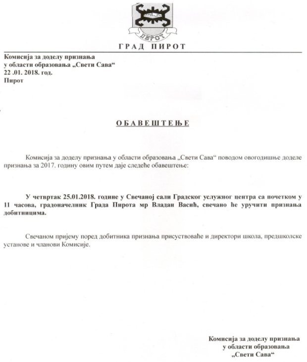 Predsednik Privremenog organa grada Pirota Vladan Vasić, svečano će uručiti ovogodišnjim dobitnicima priznanja u oblasti obrazovanja “Sveti Sava” u petak, 26.01.2024.god. u 12 sati ...