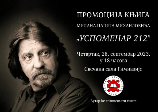 25. sep 2023. 09:02 U organizaciji Narodne biblioteke Pirot, u četvrtak 28.septembra sa početkom u 18 časova, u Svečanoj sali Gimnazije održaće se promocija knjige "Uspomenar 212", autora i glumca Milana Cacija ... -