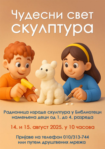 07. avg 2025. 09:11 U Narodnoj biblioteci Pirot 14. i 15. avgusta biće održana radionica izrade skulptura. Radionica je namenjena deci od 1. do 4. razreda.Za učešće je potrebna prijava telefonom ili preko dru&... -