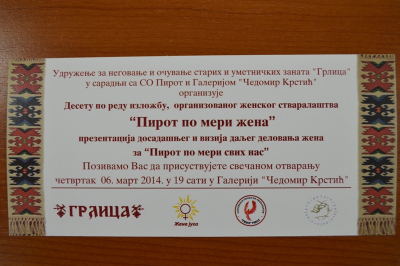06. mar 2014. 07:24 Udruženje za negovanje i očuvanje starih umetničkih zanata Grlica u saradnji sa SO Pirot i Galerijom Čedomir Krstić organizuje sutra izložbu ženskog stvaralaštva pod nazivom „Pirot po meri žena“. ... -
