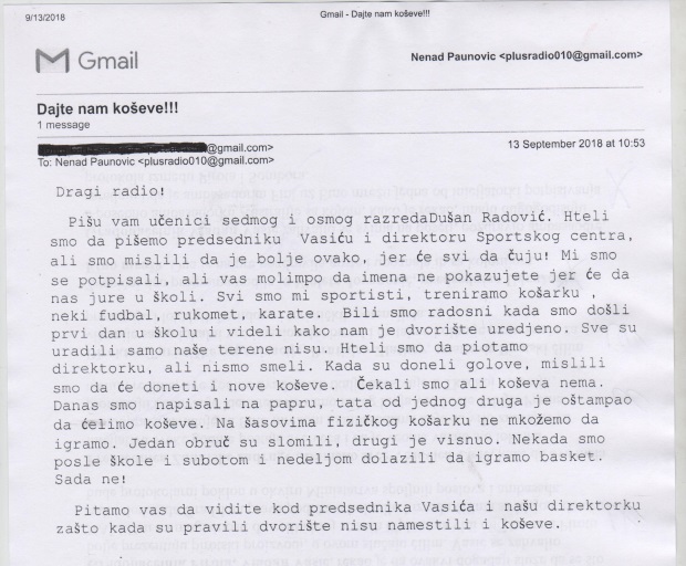 Danas nam je stigao mejl a nešto kasnije i slike iz škole. Naime, grupa učenika, njih 23 koji su se potpisali, taj deo na mejlu neću iz opravdanih razloga postaviti, traže da se vrate, ili postave novi koševi. Da li sa novim konstrukcijama, jer su ove već nesigurne, ili samo obruči, s obzirom da je jedan polomljen i odnet, a drugi ne može da se koristi.