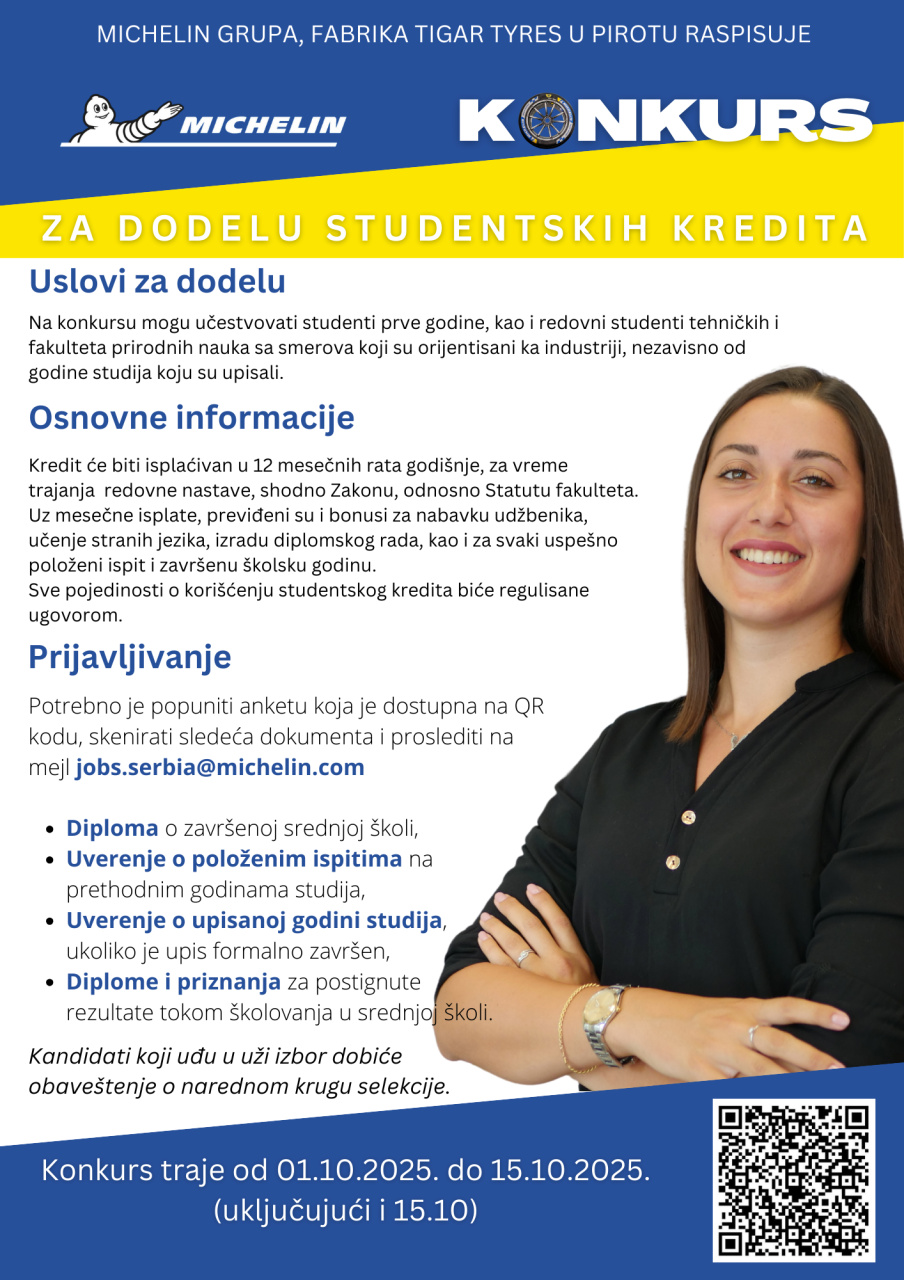 01. okt 2025. 11:32 Mišelin grupa, fabrika Tigar tajers u Pirotu raspisuje Konkurs za dodelu studentskih kredita, na kojem mogu da učestvuju studenti prve godine i redovni studenti tehničkih fakulteta i prirodnih ... -