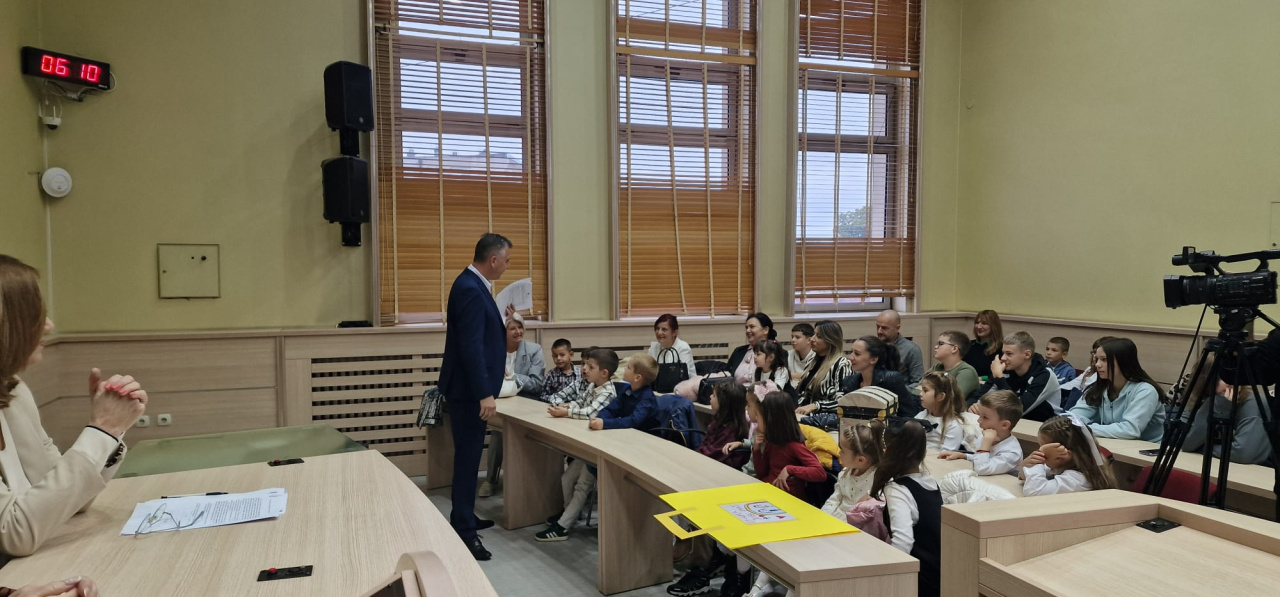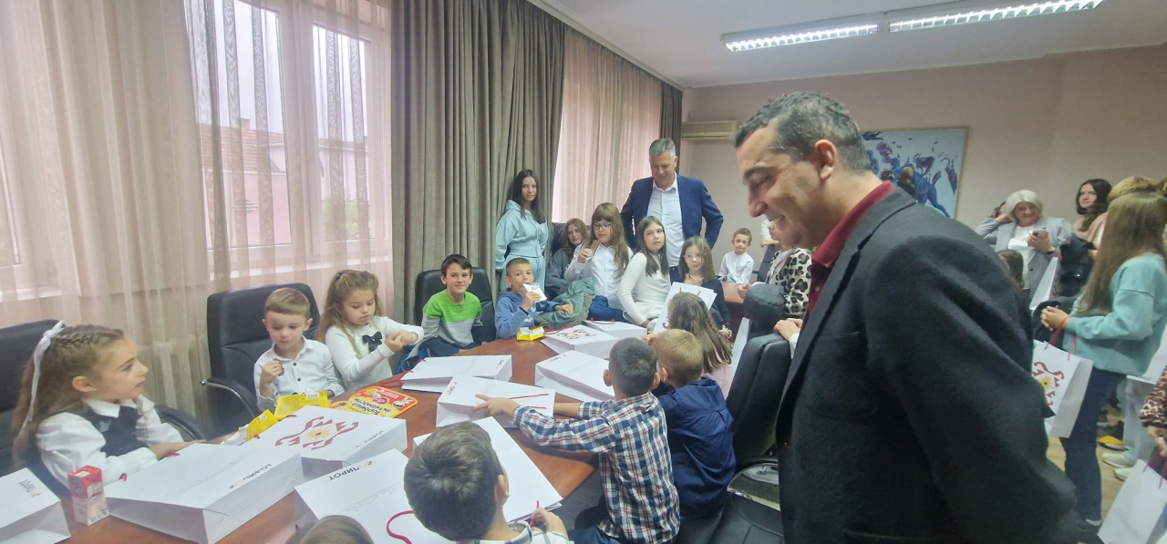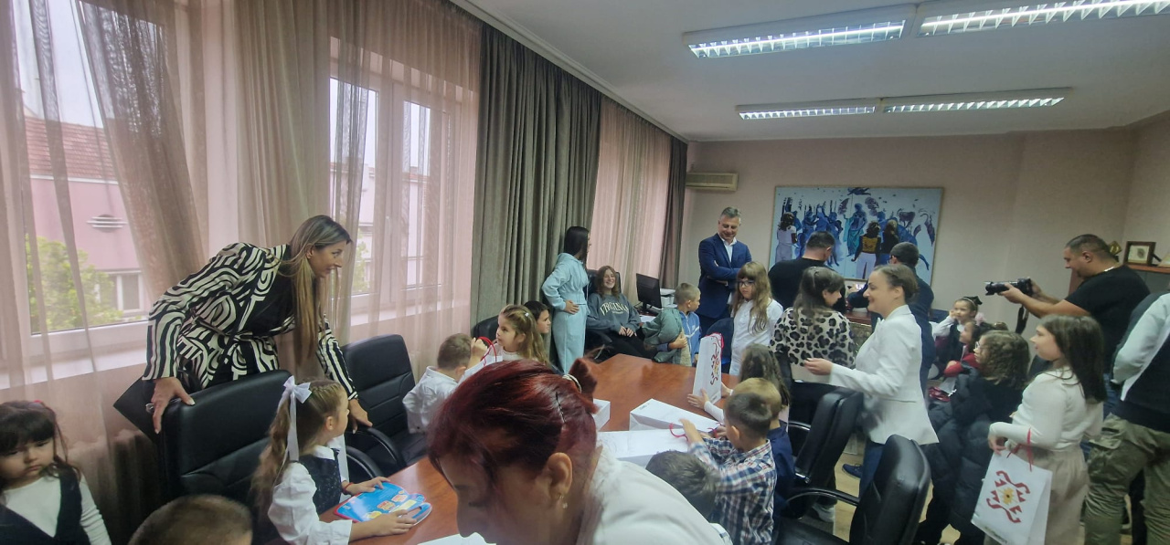 Tim povodom danas je u skupštinskoj sali Grada Pirota organizovano druženje dece sa gradonačelnikom Vladanom Vasićem.