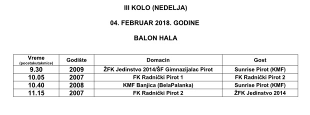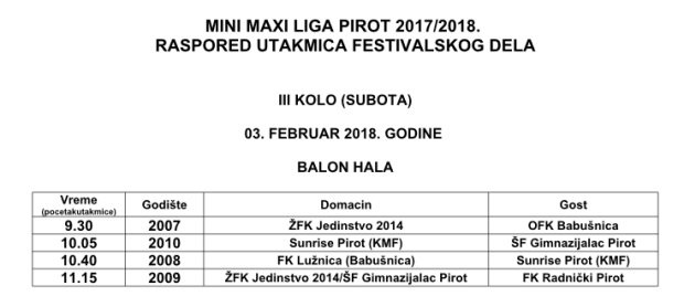 Objavljujemo raspored utakmica trećeg kola festivalskog dela MINI MAXI LIGE PIROT 2017/2018. Treće kolo je na programu u subotu 3.februara. Utakmice se igraju u Balon hali.