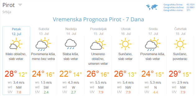U Pirotu u 12 časova - temperatura 23 stepena, vlaga 37%, pritisak 968mb, vetar zapadni 2m/s.