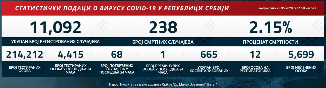 U Republici Srbiji je do 15 časova 23. maja 2020. godine registrovano ukupno 11.092 potvrđena slučaja COVID 19.