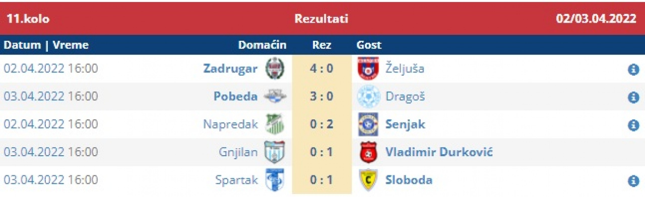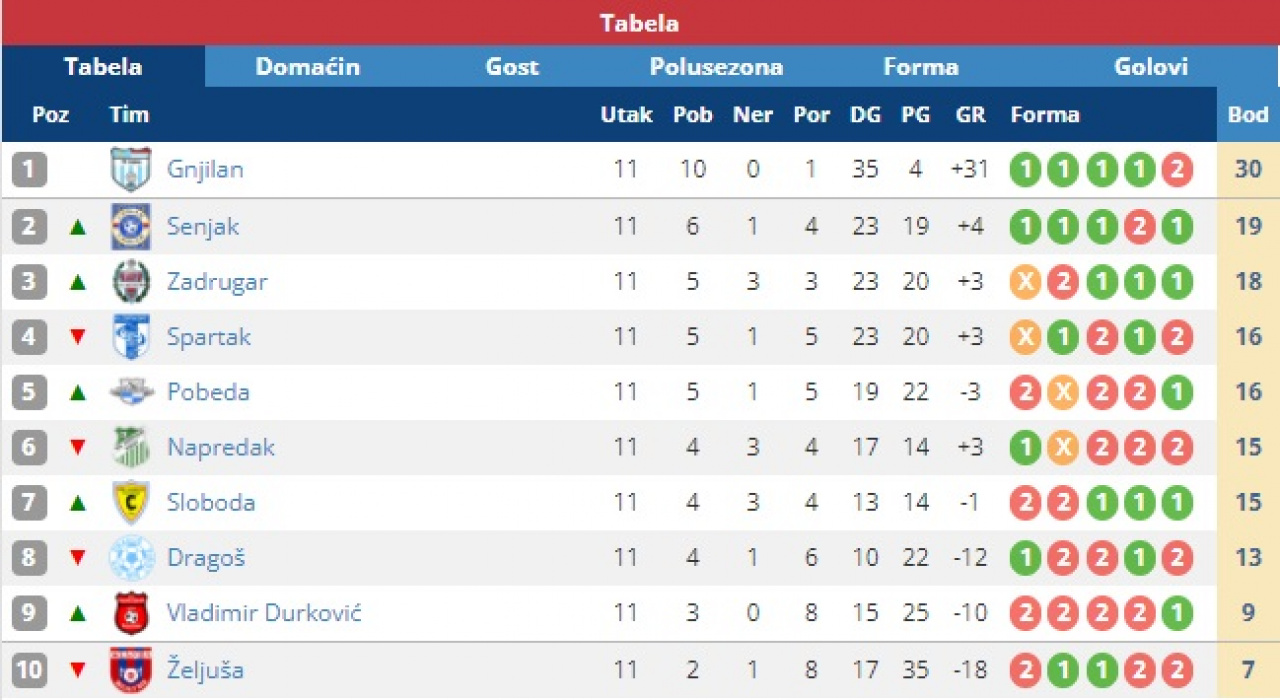 23. nov 2025. 18:32 Srpska liga Istok, 15. koloStadion "Dragan Nikolić"Pirot: Radnički - Timok (Zaječar) 1:2 (1:2)Radnički: Ristić, Antić, Tanasijević, Petrov, Mladenović, Ristov, S. Stanković, Dušanić (...
