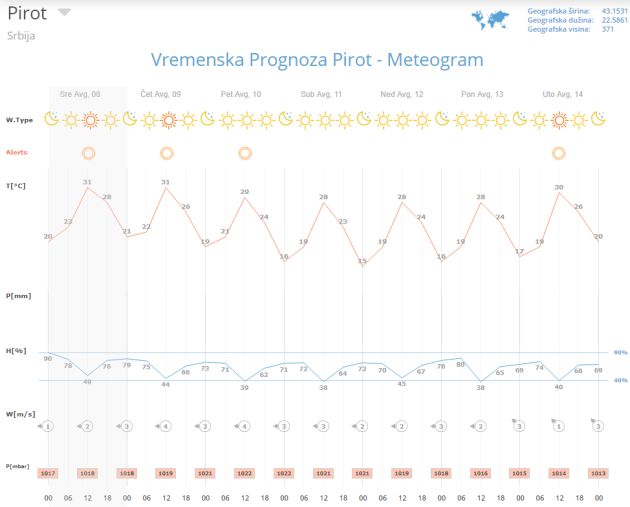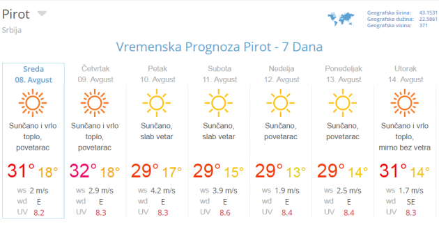 Prema prognozi za narednih sedam dana, u Srbiji se narednih dana očekuje sunčano i toplo, s najvišom temperaturom od 31 do 35 C, samo je u planinskim predelima ponegde moguć kratkotrajni pljusak sa grmljavinom, naročito za vikend.