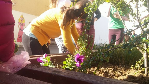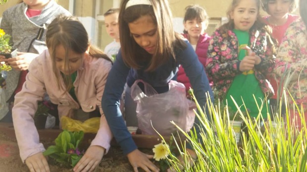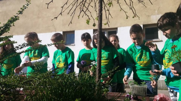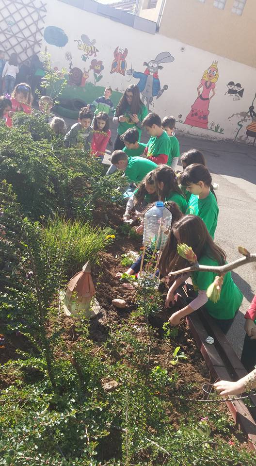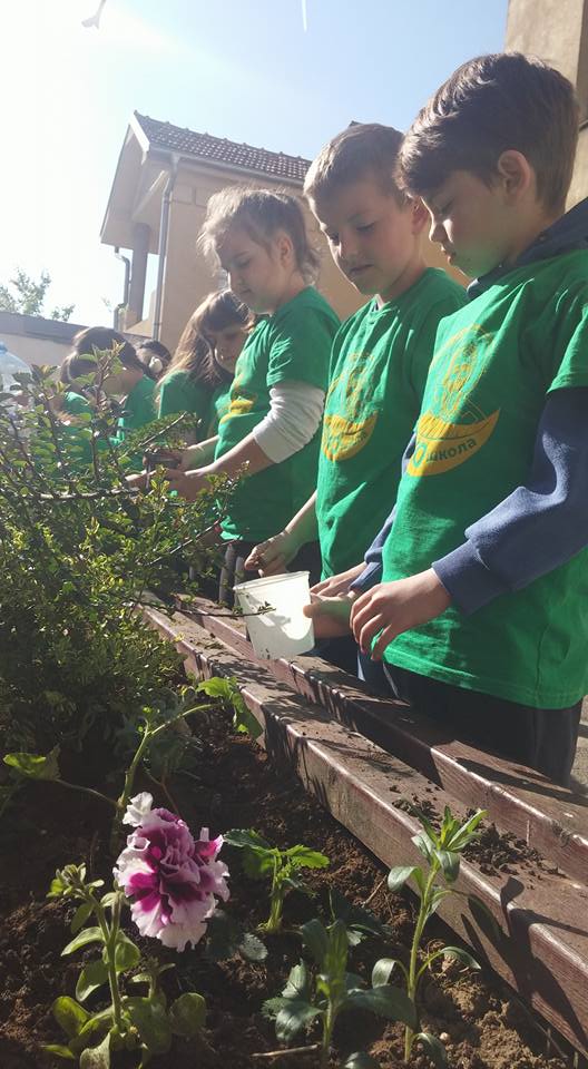 Učenici nižih razreda su doneli sadnice ukrasnih biljaka i uz pomoć svojih učitelja i drugara starijeg uzrasta oplemenili su prostor u dvorištu škole.