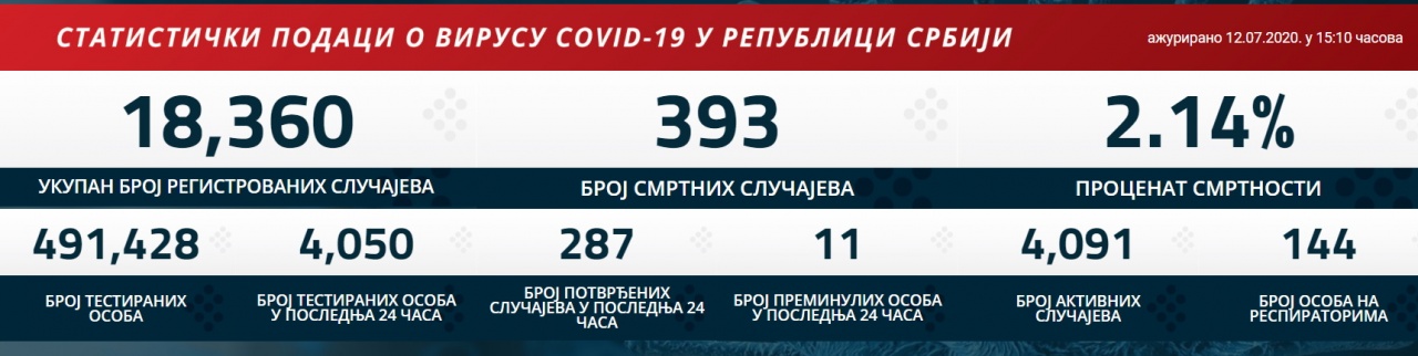 U Republici Srbiji je do 15 časova 12. jula 2020. godine registrovano ukupno 18.360 potvrđenih slučajeva COVID 19.