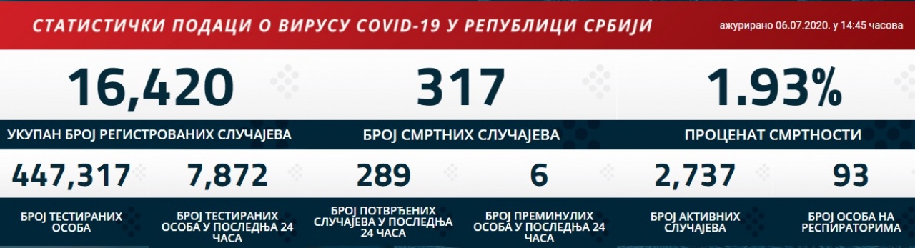 U Republici Srbiji je do 6. jula 2020. godine u 15 časova registrovano ukupno 16.420 slučajeva Covid 19.