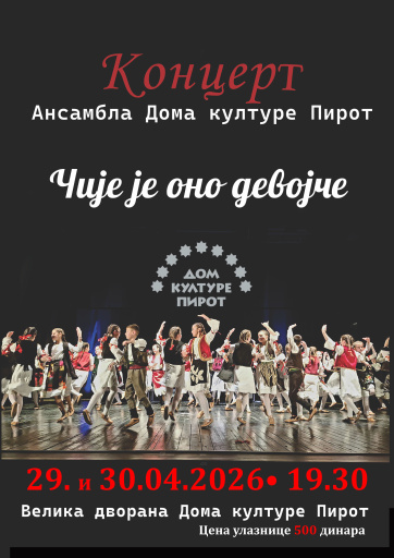 U sredu, 29. i četvrtak 30. aprila 2026. godine od 19.30 sati u velikoj dvorani Doma kulture Pirot održaće se koncerti Ansambla Doma kulture Pirot pod nazivom „Čije je ono devojče...“.