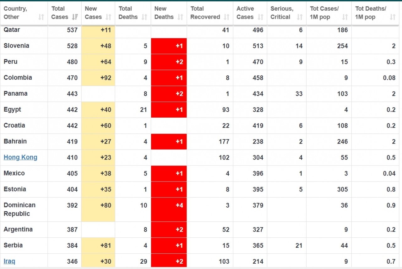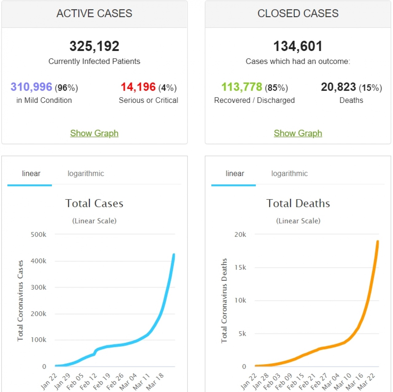 Zaraza koronavirusom do sada je potvrđena kod više od 460.000 ljudi širom sveta, od kojih je umrlo više od 20.000, prenosi sajt https://www.worldometers.info/coronavirus