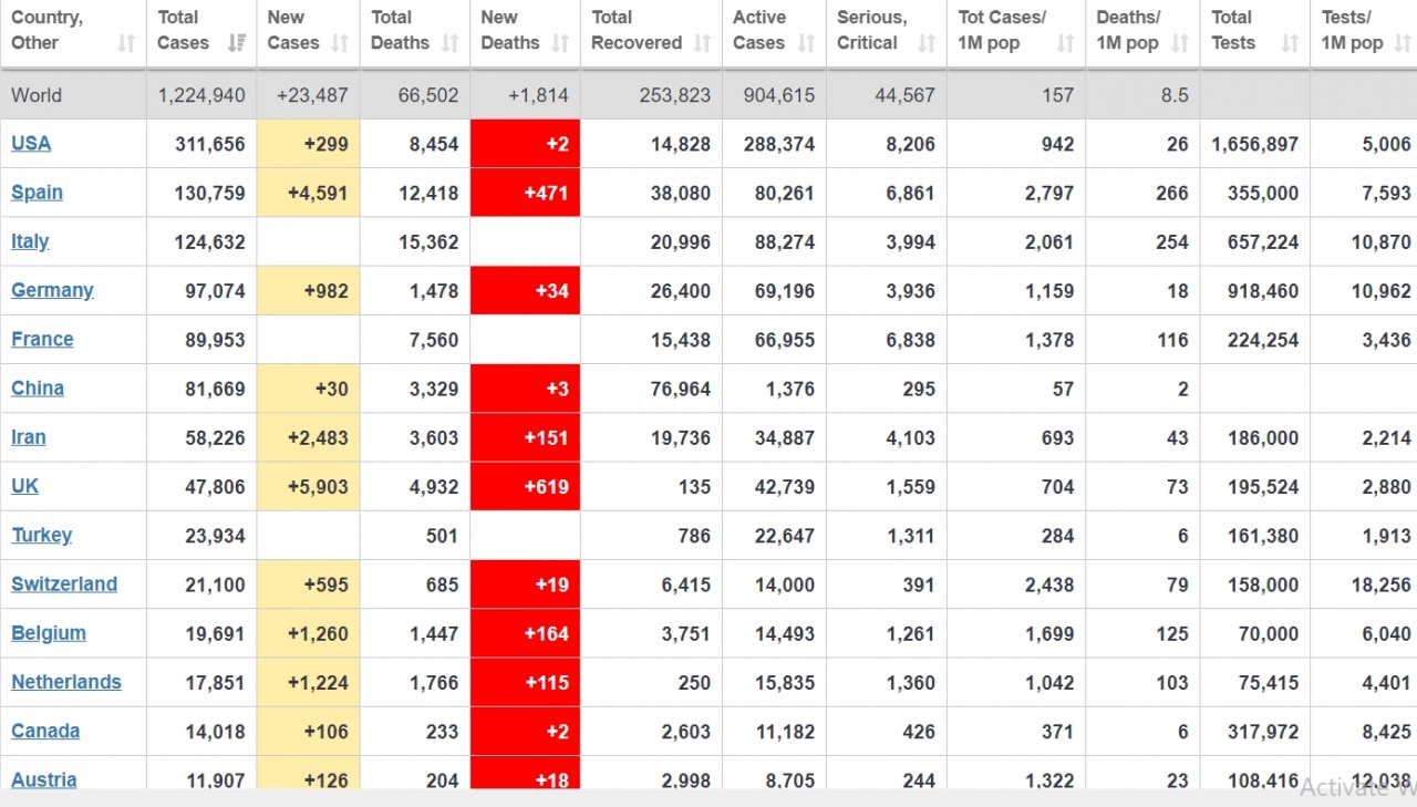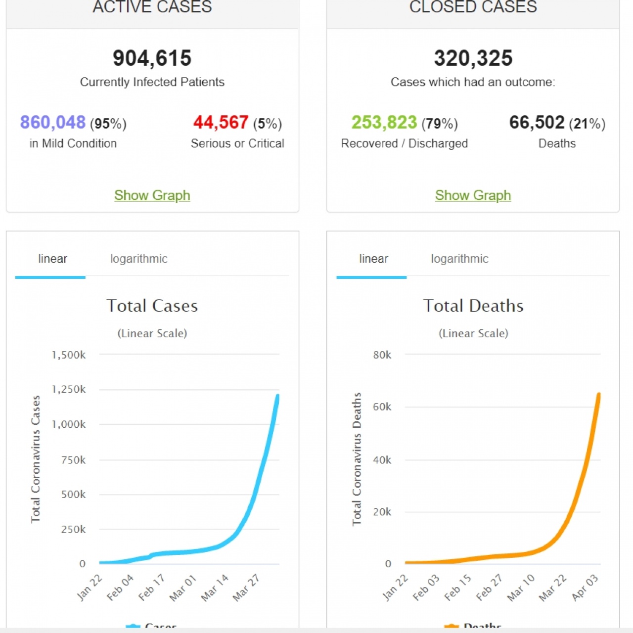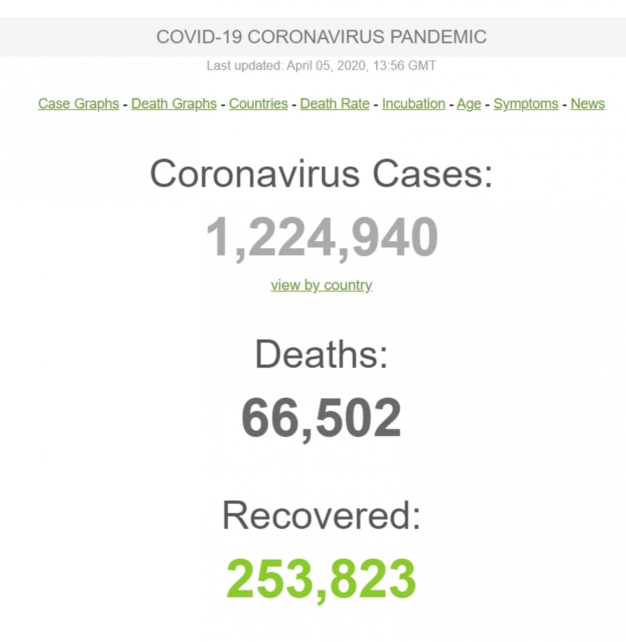 Svetski sajt worldometers.info/coronavirus objavljuje u 16 časova, 5. aprila 2020. da je u svetu na današnji dan od korona virusa obolelo preko 1,2 miliona ljudi, dok je preko 66.500 ljudi od ovog virua i preminulo.