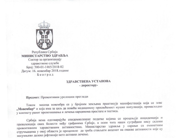 U skladu sa dopisom Ministarstva zdravlja, u okviru akcije „Movembar“, Opšta bolnica Pirot organizuje akciju preventivnih uroloških pregleda koja ima za cilj da poveća medicinsku posvećenost muške populacije, prevashodno u kontekstu ranog prepoznavanja i lečenja prostate i testisa.