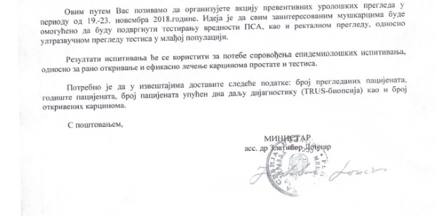 Pozivamo građane da se odazovu preventivnim urološkim pregledima u cilju blagovremenog otkrivanja karcinoma prostate i karcinoma testisa jer rana dijagnostika omogućava visok stepen izlečenja.