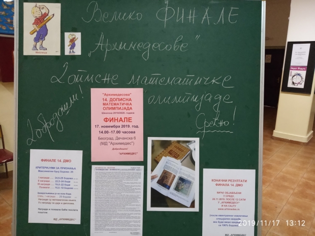 Finale XIV Dopisne matematičke olimpijade u organizaciji Matematičkog društva "Arhimedes" održano je 17. novembra. Učestvovala su 62 učenika od V do VIII razreda osnovnih škola iz cele Srbije.