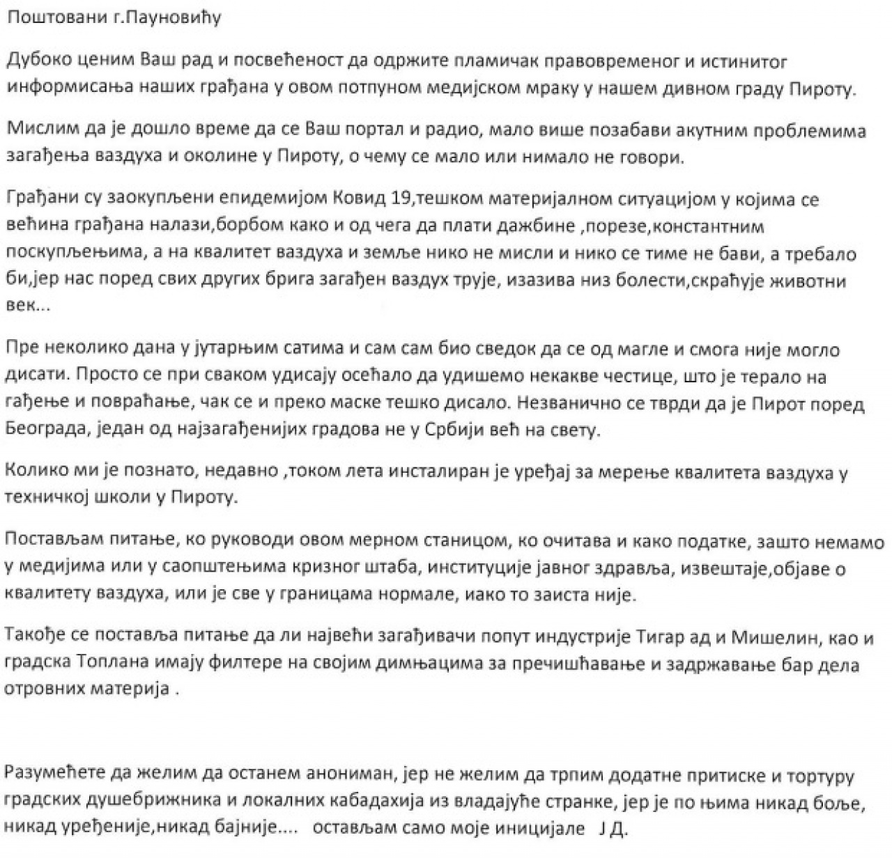 Vaša pisma: Kakav vazduh udišemo? Ko kontroliše kvalitet vazduha u Pirotu?