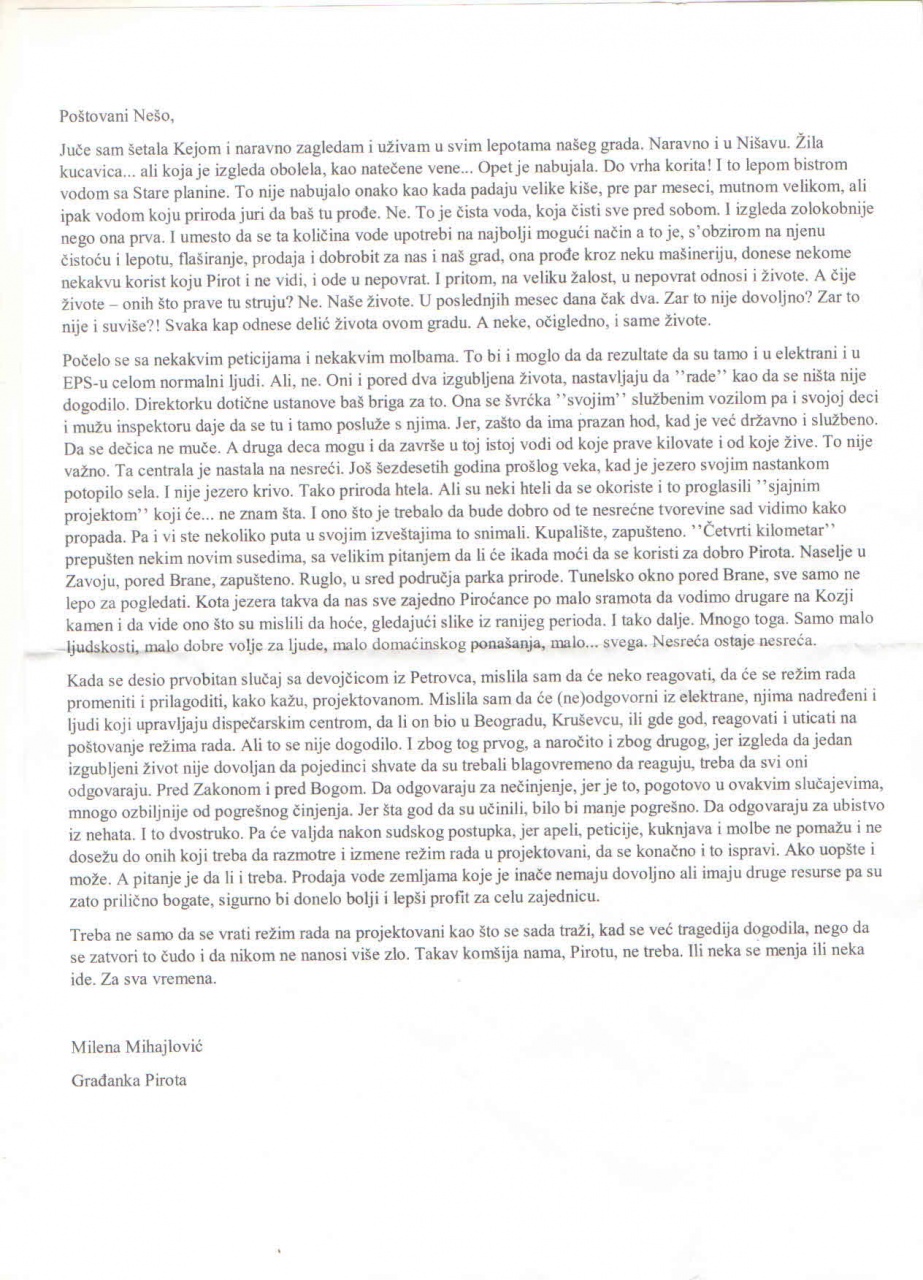 Vaša pisma: Milena Mihajlović: Zašto EPS i HE Pirot ne reaguju?
