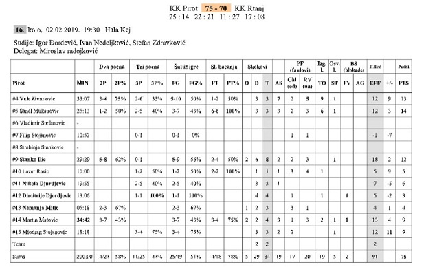 Pirot: KK Pirot - Rtanj Boljevac 75 : 70 (23:14, 22:21, 11:27, 17:8)