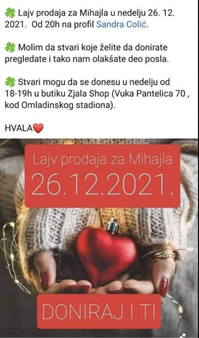 Poštovani, potrebna nam je vaša medijska pomoć. Večeras ćemo na profilu Sandra Colic održati live prodaju. Odziv je bio veliki, puno devojaka je doniralo stvari u humanitarne svrhe. Potrebno je da objavite vest kako bi se još više devojaka uključilo u laj prodaju. Sav novac koji bude prikupljen biće uplaćen za lečenje našeg sugrađanina, malog Mihajla Stamenkova. Hvala unapred