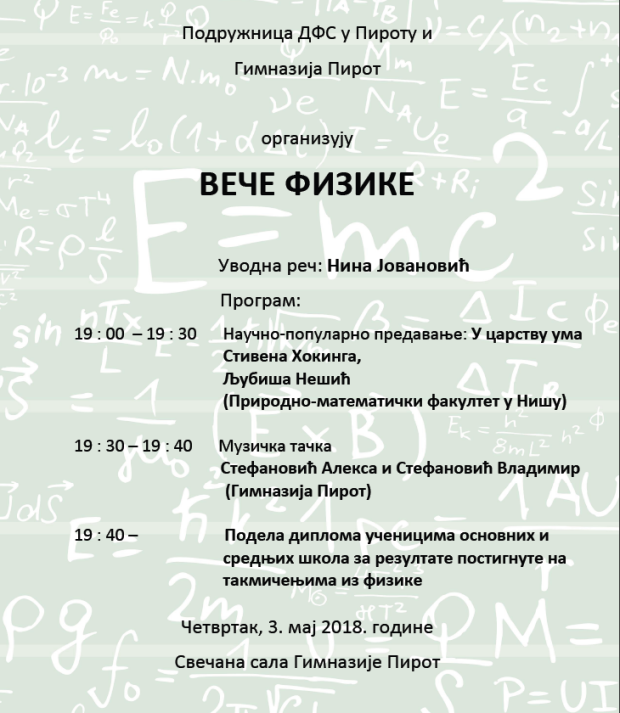 U četvrtak 3.maja sa početkom u 19 časova u Svečanoj sali Gimnazije biće održano Veče fizike. Tema večeri je "U Carstvu uma Stivena Hokinga", a predavači su Ljubiša Nešić, profesor Prirodno-matematičkog fakulteta u Nišu i Nina Jovanović, profesor fizike u Gimnaziji Pirot.
