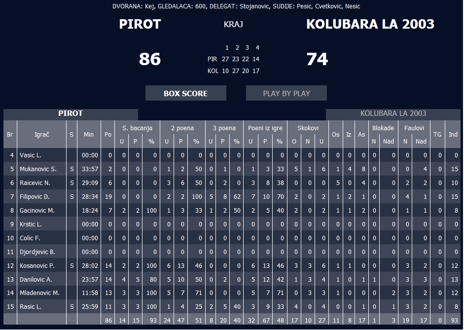 sve moguće domaće lige, bio u inostranstvu i koji sam rešava utakmice.Jeste Ljubojević postigao 27, ali on nije imao pratioce , kakve je juče imao naš košgeter Dušan Filipović. Svoju ,,rolu,, odigrali su i Kosanović,Mladenović, Rašić Danilović, Gaćinović, Raičević, što je omogućilo da Pirot deluje ubedljivo protiv rivala koji će mnoge namučiti.. Mukanović i ovoga puta nije postigao mnogo koševa , ali ovaj,,zlata vredan momak,, pravi je motor tima sa minutažom za postovanje.