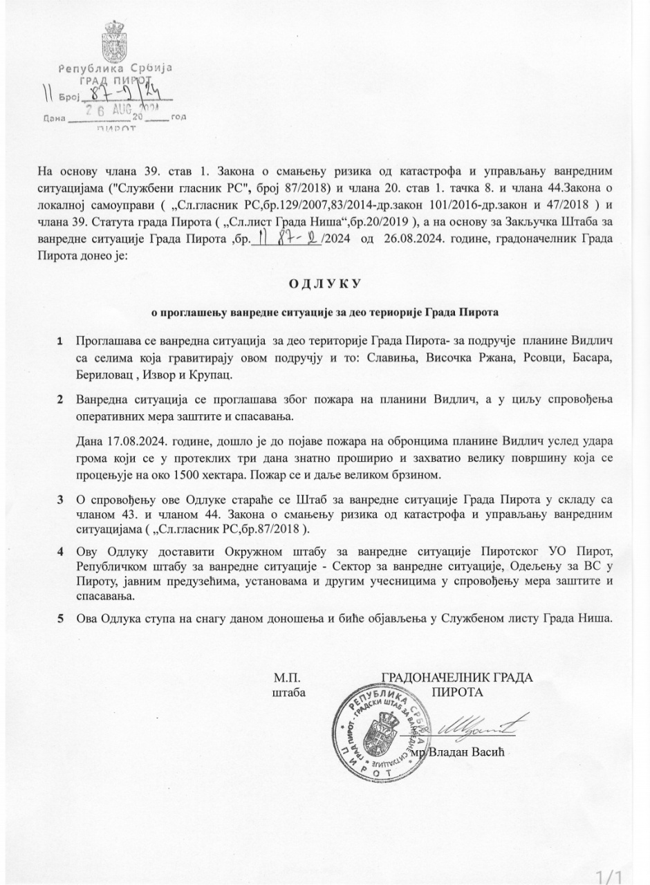 - Proglašava se vanredna situacija za deo teritorije Grada Pirota- za područje planine Vidličsa selima koja gravitiraju ovom području i to: Slavinja, Visočka Ržana, Rsovci, Basara, Berilovac, Izvor i Krupac.