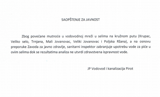Tokom popodneva dobili smo saopštenje u kojem se navodi da zbog povećanje mutnoće od danas voda nije za piće i u selima na Kružnom putu - Krupcu, Velikom Selu, Trnjani, Malom Jovanovcu, Velikom Jovanovcu i Poljskoj Ržani.