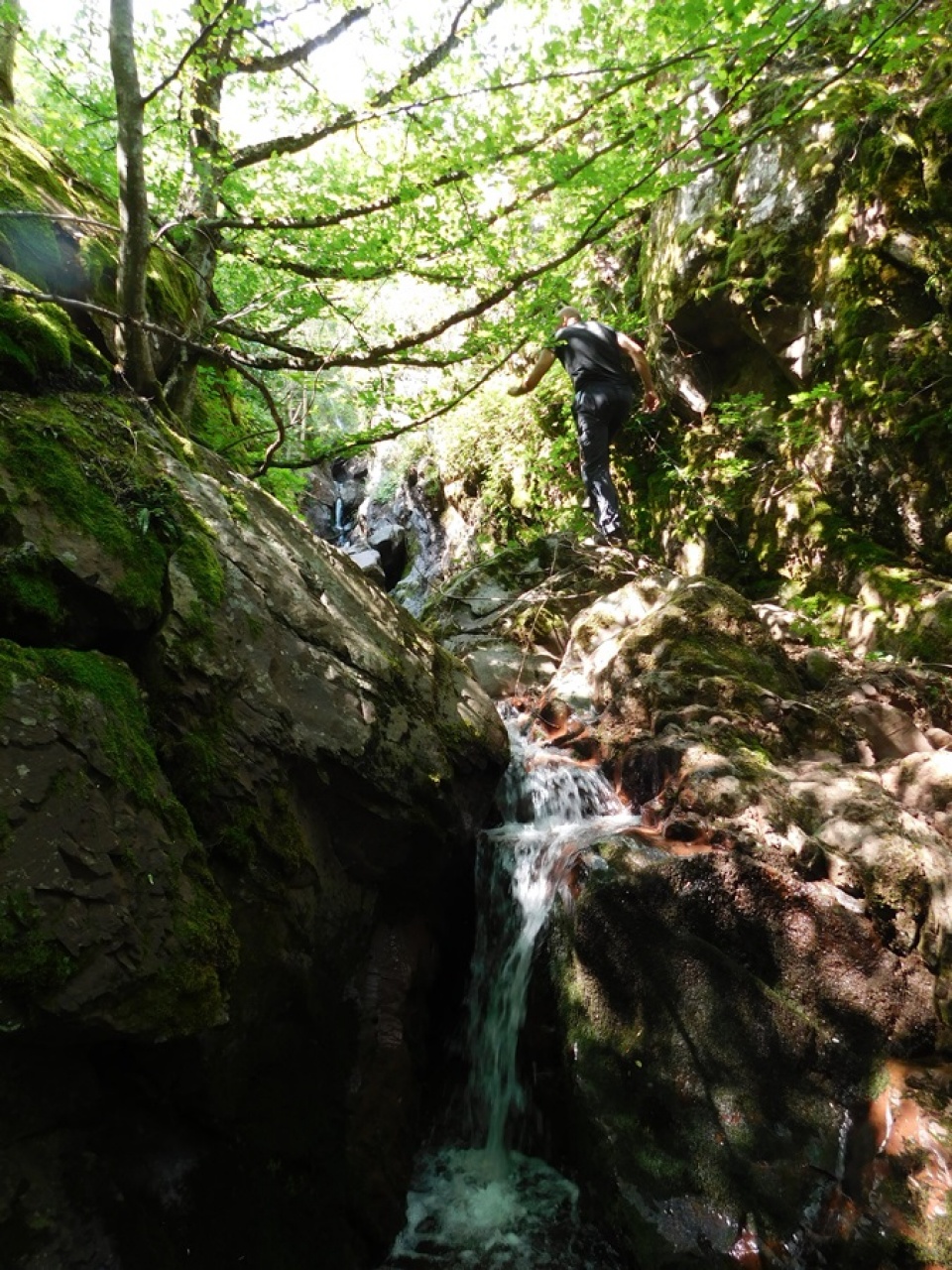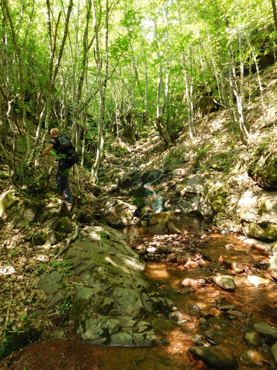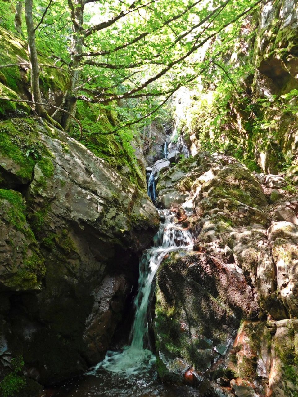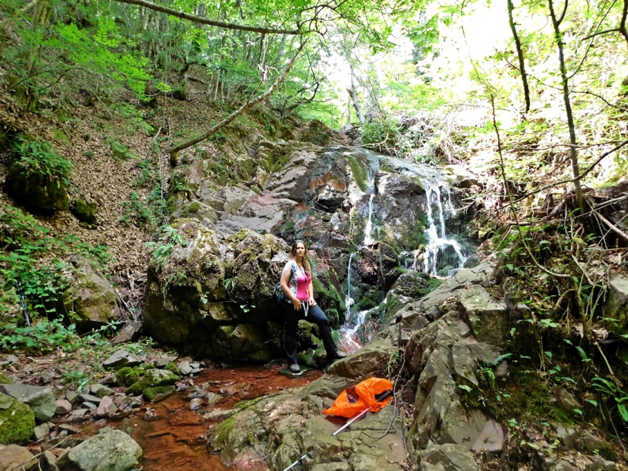 Nakon nekog vremena eto nam neke utabane stazice, pratimo je i ona nas odvodi sve do ušća dva potoka. Taj drugi nama treba tako da krećemo uzvodno u potragu za Šugljinim skokom. Penjemo se uz puno manjih kaskada, naravno sve to drugačije izgleda sigurno u proleće kada je velika voda, ali je i kretanje i penjanje uz klizavo kamenje verovatno teže. Pošto je nama prvi put sve deluje iovako lepo i zanimljivo. Nakon nešto više od pola sata veranja kroz dol uz povremeno branje pečuraka sa strane nailazimo na tesnac. Da li je tu vodopad? Da tu je odmah iznad ali da bi došli ispod njega trebalo je savladati taj deo preko velikog kamenja a pre toga pregaziti vir ispred. Nemamo vremena sada za tu avanturu pa tražimo najpogodnije mesto kako bi izašli na stene i videli vodopad odozgo. A gore iako malo vode prizor zaista lep, preko stene okružene sada gustom vegetacijom sliva se voda. Prilazimo polako što bliže ivici kako bi ga videli u celosti i fotografisali. Vodopad visine preko deset metara zvani Šugljin skok. Zašto se tako zove još nismo saznali. Iznad njega ima još vodopada ali to moramo obići neki drugi put jer za takav teren treba ipak malo više vremena a i oblaci su se povremeno navlačili i ne bi valjalo da kiša namokri stene pre nego sto se spustimo dole na put.