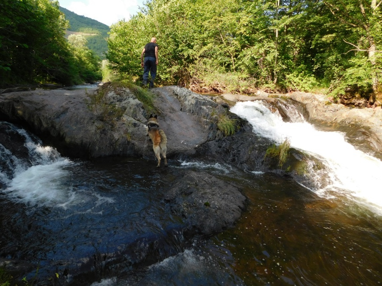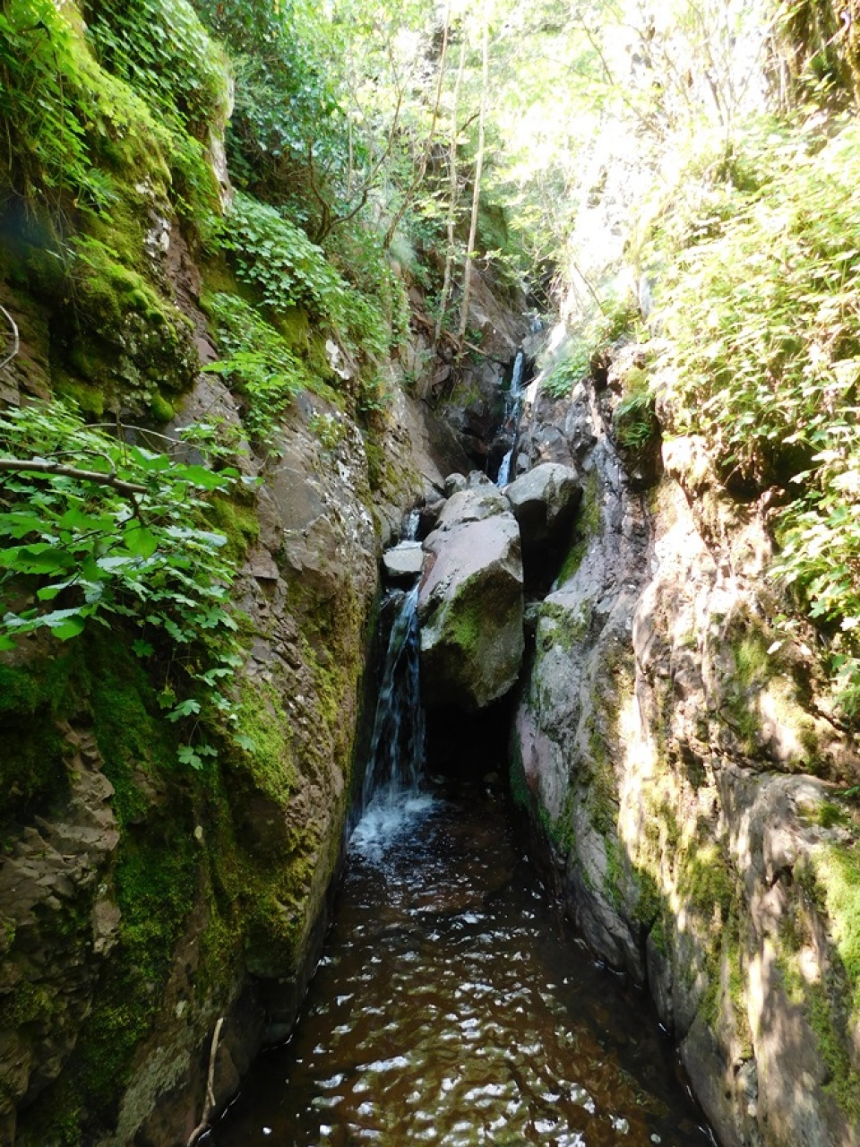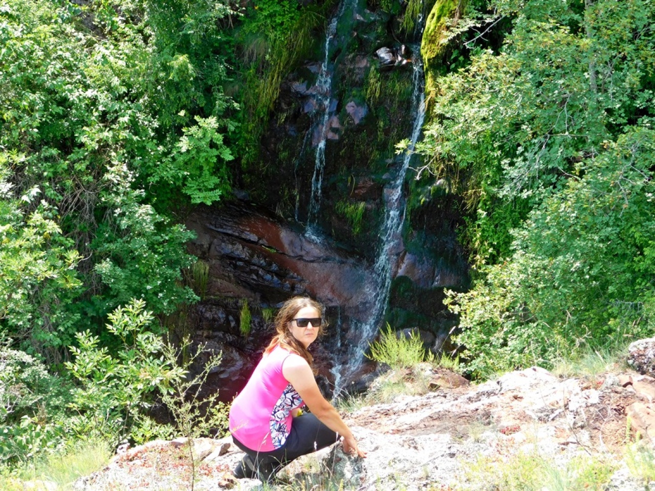Nakon nekog vremena eto nam neke utabane stazice, pratimo je i ona nas odvodi sve do ušća dva potoka. Taj drugi nama treba tako da krećemo uzvodno u potragu za Šugljinim skokom. Penjemo se uz puno manjih kaskada, naravno sve to drugačije izgleda sigurno u proleće kada je velika voda, ali je i kretanje i penjanje uz klizavo kamenje verovatno teže. Pošto je nama prvi put sve deluje iovako lepo i zanimljivo. Nakon nešto više od pola sata veranja kroz dol uz povremeno branje pečuraka sa strane nailazimo na tesnac. Da li je tu vodopad? Da tu je odmah iznad ali da bi došli ispod njega trebalo je savladati taj deo preko velikog kamenja a pre toga pregaziti vir ispred. Nemamo vremena sada za tu avanturu pa tražimo najpogodnije mesto kako bi izašli na stene i videli vodopad odozgo. A gore iako malo vode prizor zaista lep, preko stene okružene sada gustom vegetacijom sliva se voda. Prilazimo polako što bliže ivici kako bi ga videli u celosti i fotografisali. Vodopad visine preko deset metara zvani Šugljin skok. Zašto se tako zove još nismo saznali. Iznad njega ima još vodopada ali to moramo obići neki drugi put jer za takav teren treba ipak malo više vremena a i oblaci su se povremeno navlačili i ne bi valjalo da kiša namokri stene pre nego sto se spustimo dole na put.