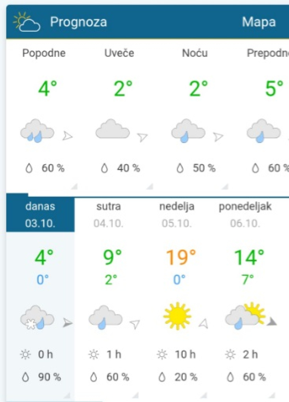 Danas, jutros 0 stepeni, u 12 sati 3 stepena.