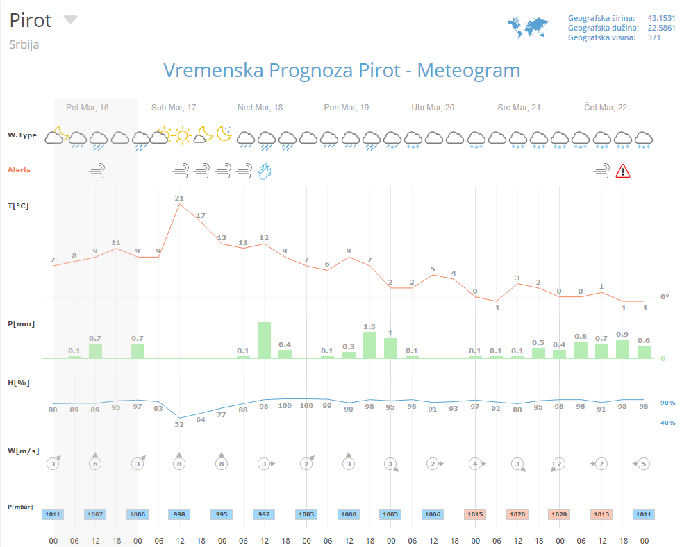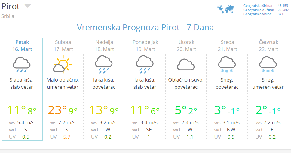 U nedelju, u severnim, zapadnim i centralnim krajevima biće osetno hladnije i vetrovito, ponegde sa slabim snegom, a u ostalim krajevima relativno toplo, sa kišom mestimično. Početkom sledeće nedelje biće oblačno, hladno, mestimično sa snegom. Temperature od minus tri do tri na severu i devet na jugoistoku. U periodu od 20. do 24. marta, očekuje se oblačno i hladno vreme, mestimično sa kišom i vlažnim snegom, uz dalje povećanje snežnog pokrivača.