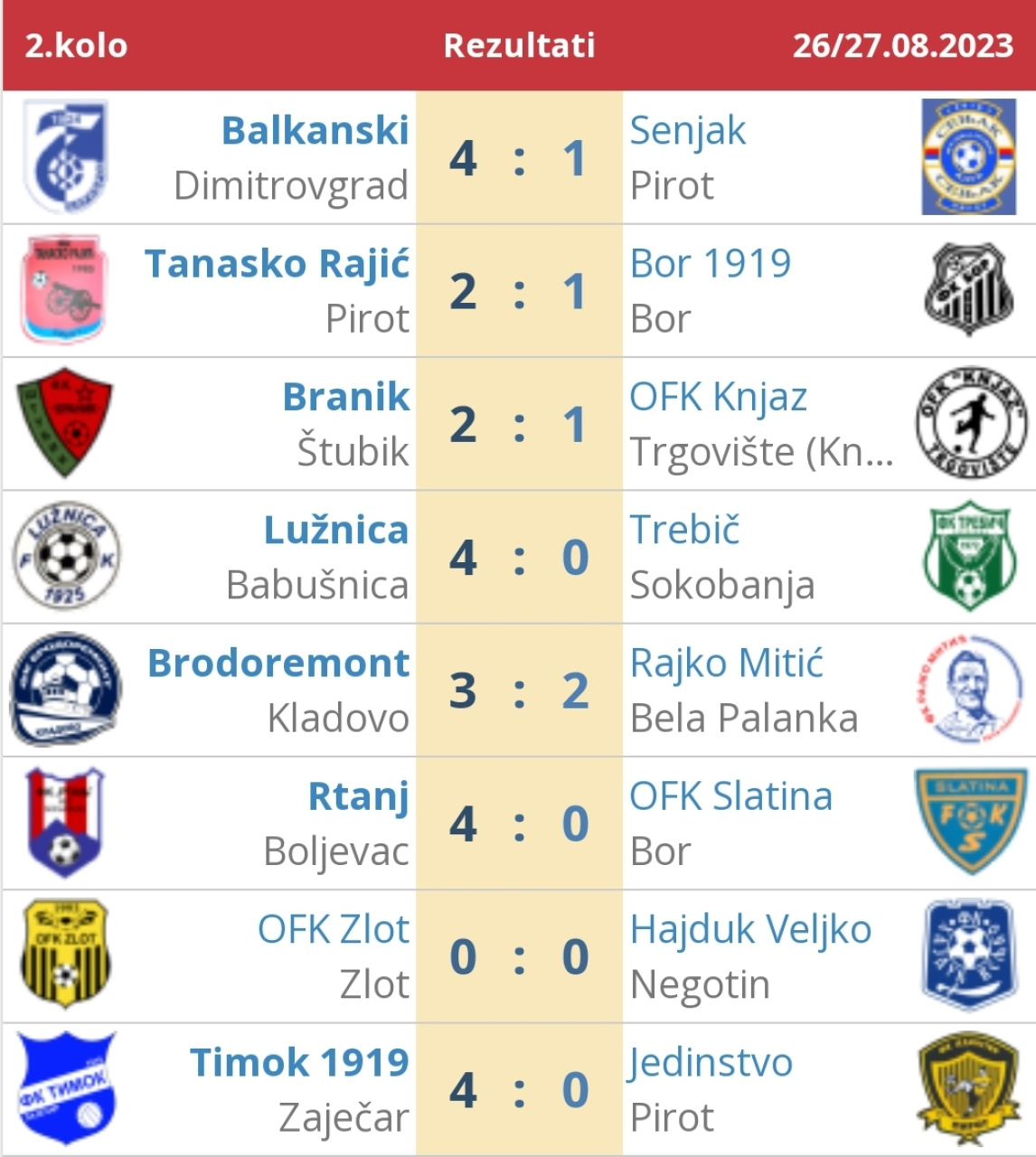 Ovog vikenda završeni su mečevi drugog kola Zone Istok. Može se reći da nijedna pirotska ekipa nije imala lakog rivala, pa zato ne čudi što je samo Tanasko Rajić kod kuće zabeležio pobedu protiv ekipe "Bora 1919" sa 2:1. U Zaječaru je Jedinstvo poraženo od favorita, ekipe Timoka sa 4:0, dok je u Dimitrovgradu isti broj golova kao i Jedinstvo primila ekipa Senjaka - 4:1 za Balkanski.