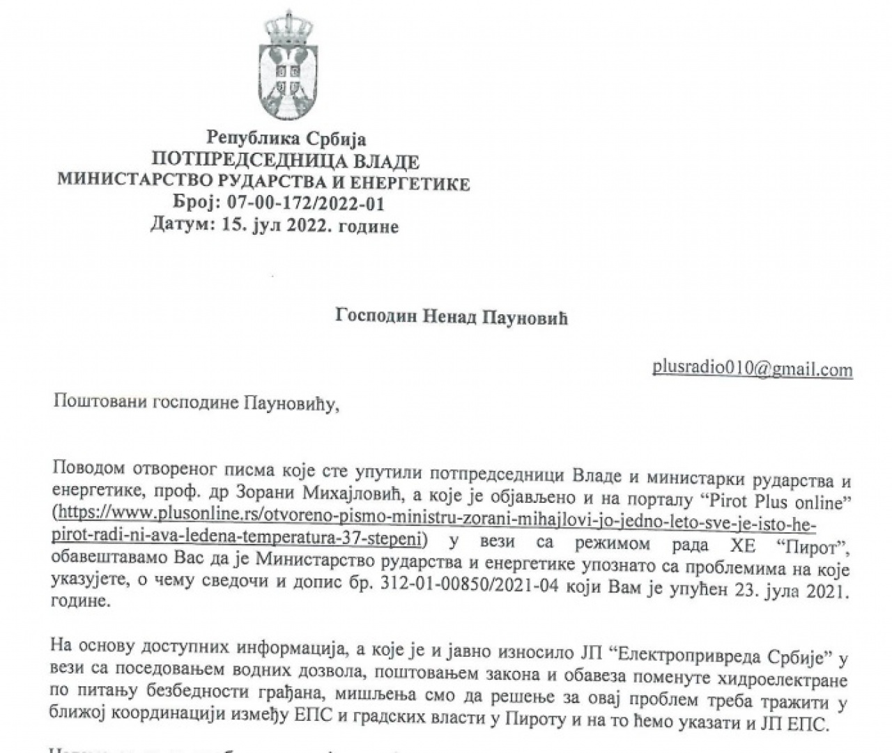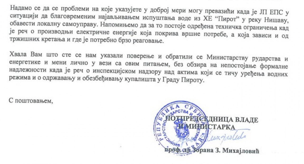 U prilogu dostavljamo dopis potpredsednice Vlade i ministarke rudarstva i energetike prof. dr Zorane Mihajlović.
